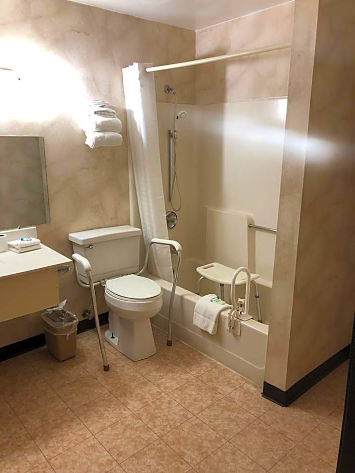 -Accessible guests rooms with mobility features with entry or passage doors that provide 32" of clear width. -Accessible parking. -Accessible public entrance. -Accessible route from the accessible public entrance to the guest rooms, registration area. and breakfast area. -Alarms-visual strobe. -Bathroom and bedroom doors at least 32 inches wide(812mm). -Braille room numbers. -Closed captioning on television or closed captioning decoders. -Grab bars in bathroom. -Level or ramp entrance into the building. -Lower clothes rack. -Lowered light switches. -Lowered peep hole in door. -Lowered sink. -Rooms accessible to wheelchairs (no steps). -Service support animals welcome. -ITY for guest use in lobby. -Van-accessible parking in the self-parking facility. -Wheelchair ramp for lobby/reception access.